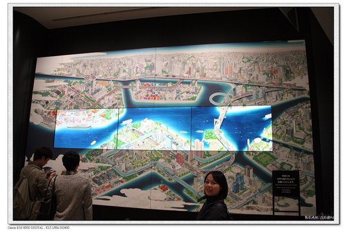 現場有3大面牆,繪製著東京都的景色,而牆面的中間是螢幕,播放著電腦動畫.